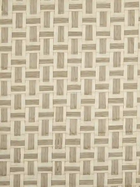 The wallpaper is yellow in color and has a woven pattern. The woven pattern is made up of horizontal and vertical strips of grasscloth. They are woven together in an interlocking pattern.